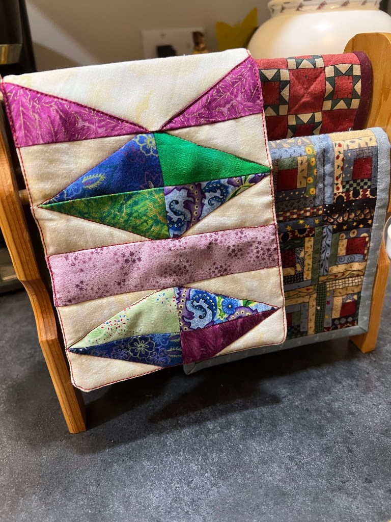 So I thought I’d start my year by giving my little quilt rack a refresh. One of my goals this year is to use up any leftover bits orphan blocks instead of adding them to the scrap bin.
