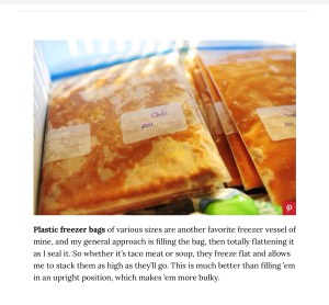 Lately I’ve been making freezer meals when I go grocery shopping. It’s so much fun to get these meals together since I cook two meals for dinner most days. My DH is a very picky eater; allergic to onions and garlic, hates vegetables and spices. Me, on the other hand would only be too happy to eat lots of vegetables every day and I really do like herbs and spices. I take gallon ziplock bags; add in my protein, vegetables, sauces, seasoning and spices. Then I can freeze them and just pull out a bag to pop in the slow cooker when I need real food. This week I made; a beef, vegetable and Chinese spices meal, a beef stew with vegetables, potatoes and broth, a sweet and sour pork with lots of vegetables and a chicken in marinara sauce with lots of veggies. Each of those freezer meals makes 3-5 meals for me once cooked so I often made mini meals after the dishes have been cooked so I have something quick for those days when I have meetings or have to go to town.