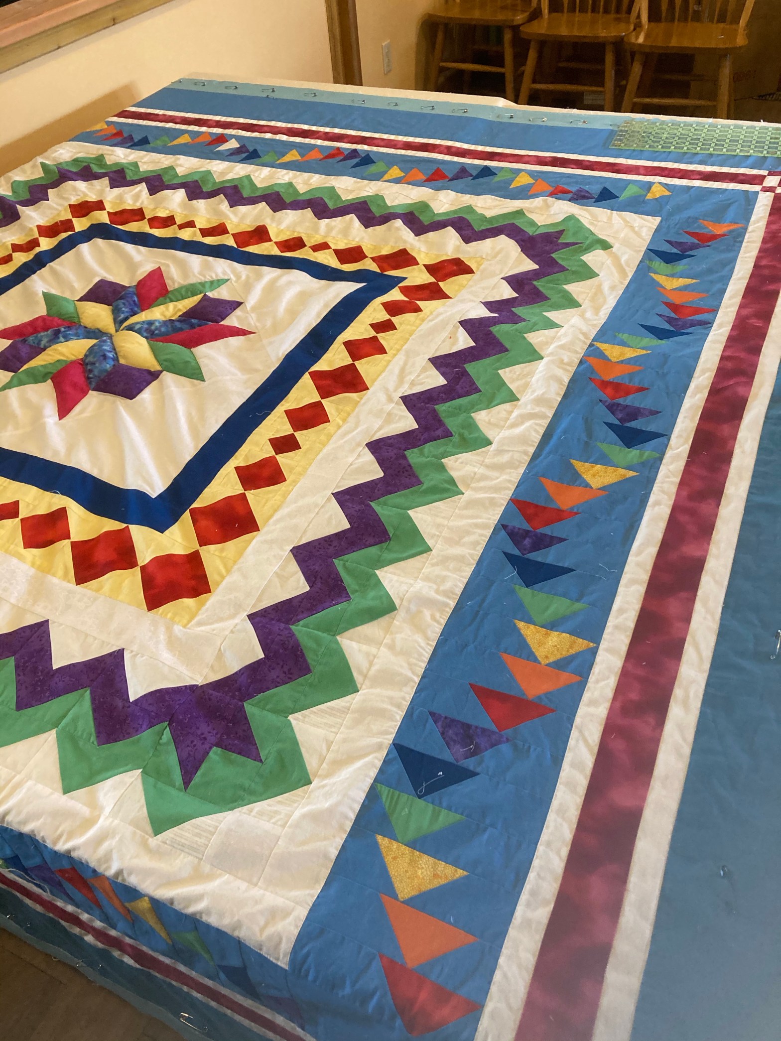 This finish is a real joy to have done. It not only completes a commission, but gets a flimsy off my To Be Quilted/UFO List. I had gone over several patterns and photos of quilts with my customer and his choice was this quilt. This top was a test pattern I did for The QuiltContinueContinue reading “Finally A Finish 😄”